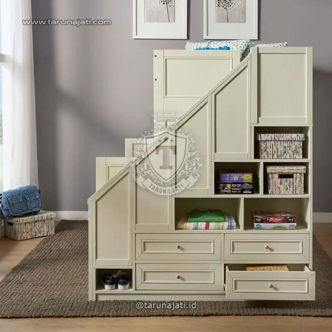 Dipan Tingkat Anak Berlaci adalah solusi yang praktis dan serbaguna untuk menciptakan ruang tidur yang terorganisir dan nyaman bagi anak-anak. Dipan ini dirancang dengan dua tingkat tidur yang disusun secara vertikal, dengan laci dibagian bawah dan tangga sebagai tambahan ruang penyimpanan yang berguna. Dipan tingkat anak berlaci ini sangat kuat dan tahan lama karena dibuat dengan bahan kayu mahoni berkualitas dan dikombinasikan finishing duco warna putih membuatnya terlihat sangat modern.