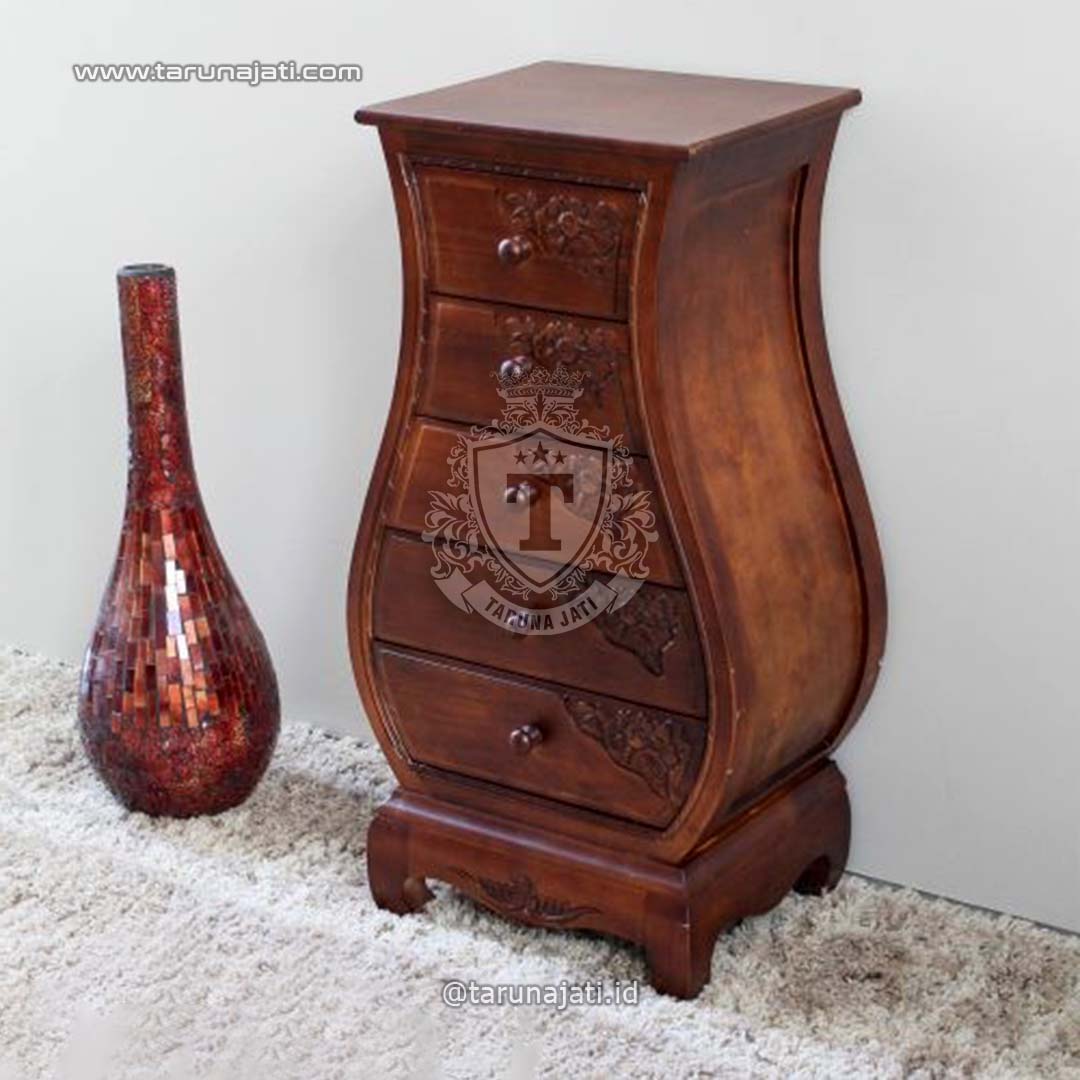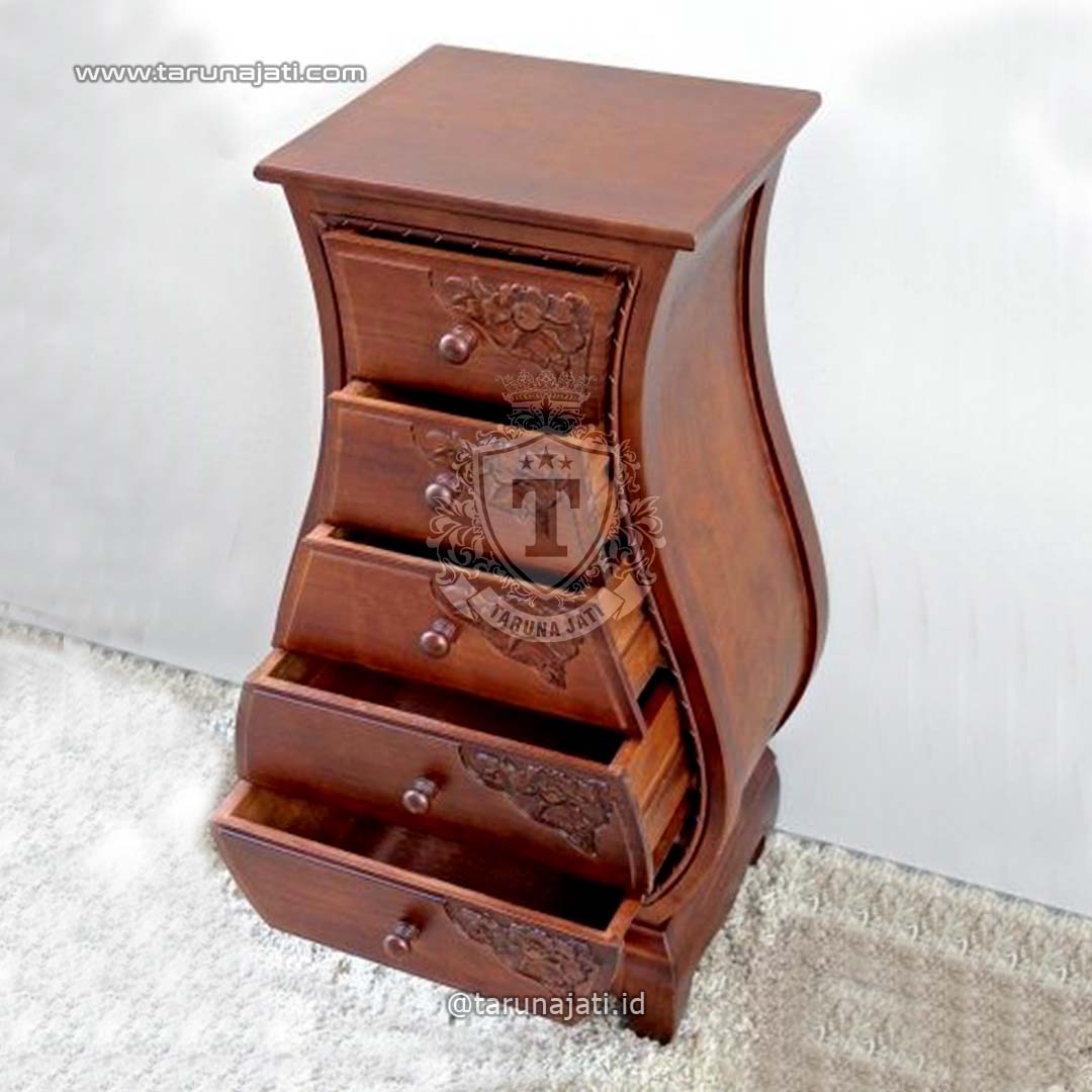 Nakas Model Jati Elegan ini hadir dengan desain minimalis yang sangat unik dengan kombinasi ukiran pada bagian lacinya membuatnya terlihat sangat indah. Nakas ini memiliki lima laci dengan ukuran yang berbeda memiliki bentuk seperti vas bunga menjadi cirikhas dari nakas ini dan dengan dibuat dari bahan kayu jati terbaik membuatnya sangat kuat dan tahan lama. Nakas jati ini dikombinasikan dengan finishing melamine warna tea gloss membuatnya sangat indah dan cocok untuk dihadirkan pada samping tempat tidur anda.