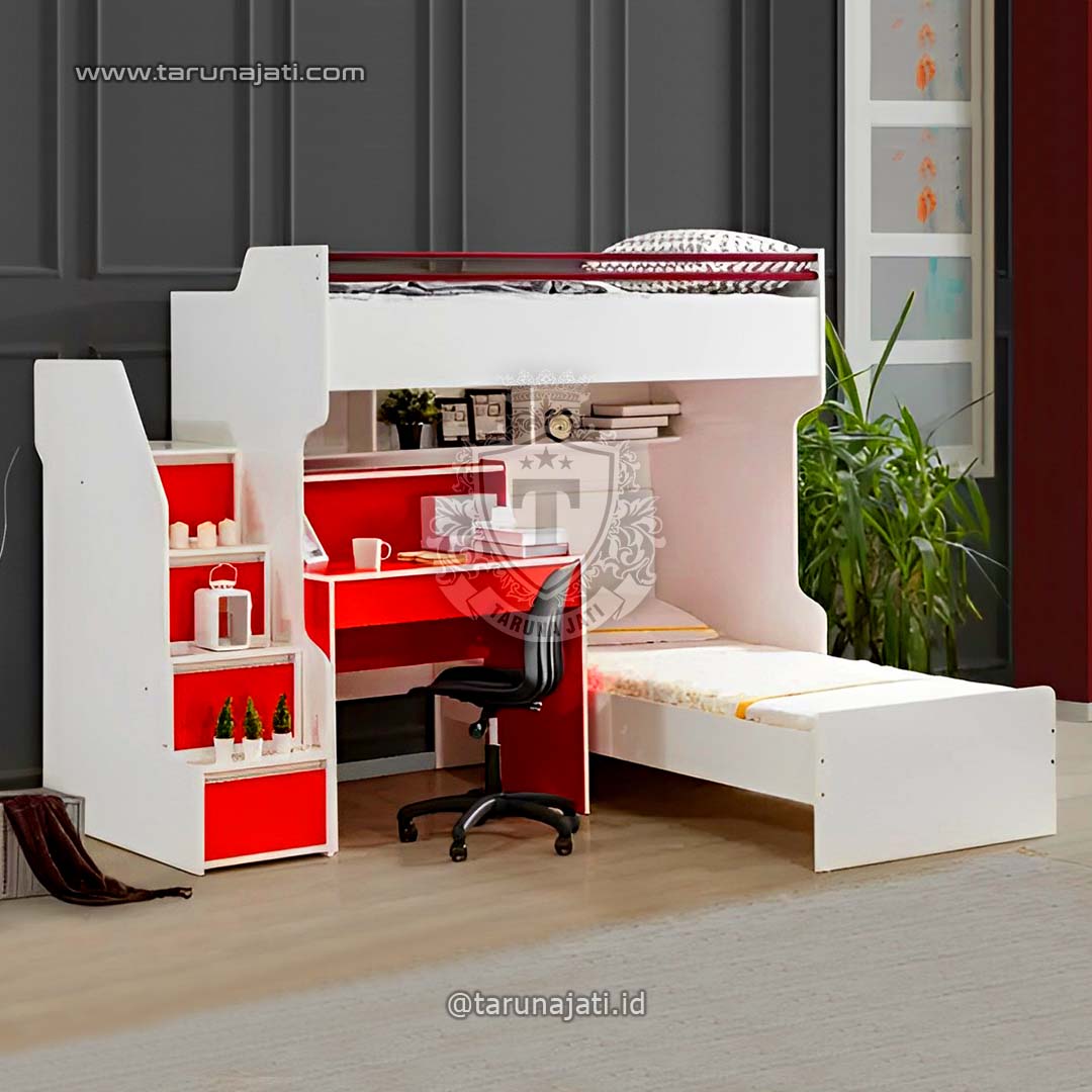 Tempat Tidur Tingkat Anak Multifungasi Tempat Tidur Tingkat Anak Multifungsi adalah pilihan cerdas dan praktis untuk menciptakan ruang tidur yang serbaguna bagi anak-anak. Tempat tidur ini dirancang dengan dua tingkat tidur memberikan kapasitas tidur yang lebih banyak dalam satu tempat tidur. Tempat tidur tingkat ini juga dilengkapi dengan meja belajar atau meja kerja yang terletak di bawah tempat tidur. Meja ini memberikan area yang nyaman bagi anak-anak untuk belajar, mengerjakan tugas sekolah, atau bermain. Ditambah dengan bayak penyimpanan laci dan rak terbuka membuatnya sangat sesuai dengan kebutuhan penyimpanan anda. Tempat tidur ini dibuat dari kayu mahoni dengan kombinasi finishing duco putih dan merah membuatnya terlihat sangat indah dan modern.